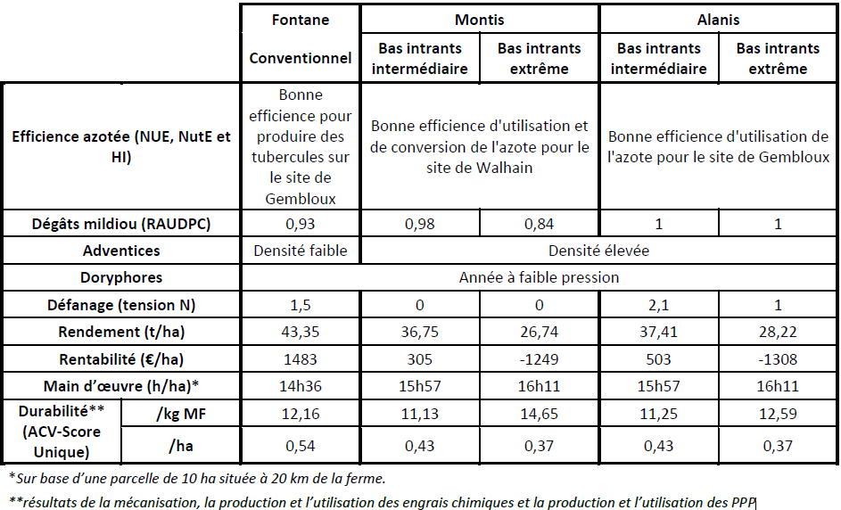 En conclusions, l’évaluation technique, économique et environnementale des itinéraires bas intrants a permis de démontrer que, dans les conditions de réduction d’intrants intermédiaires, il était techniquement faisable de produire des pommes de terre à large échelle tout en étant économiquement viable et en ayant un impact environnemental réduit par hectare cultivé.